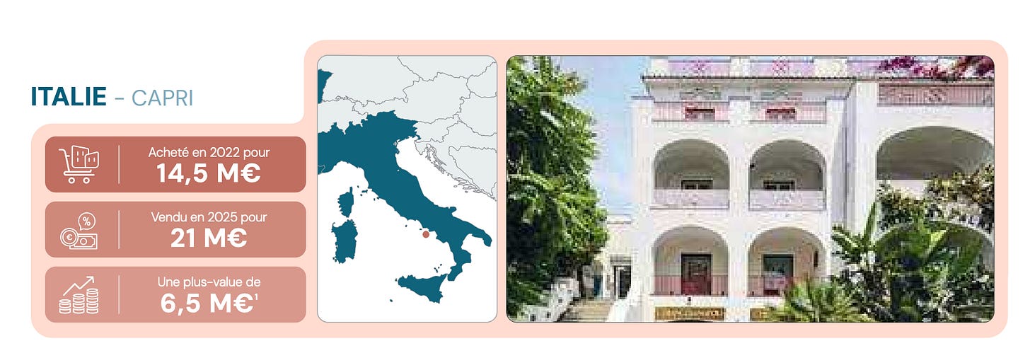 L’hôtel de Capri (Italie), acheté 14,5 M€ en 2022, a été vendu 21 M€ (+6,5 M€ de plus-value, soit +45 % en seulement 3 ans).