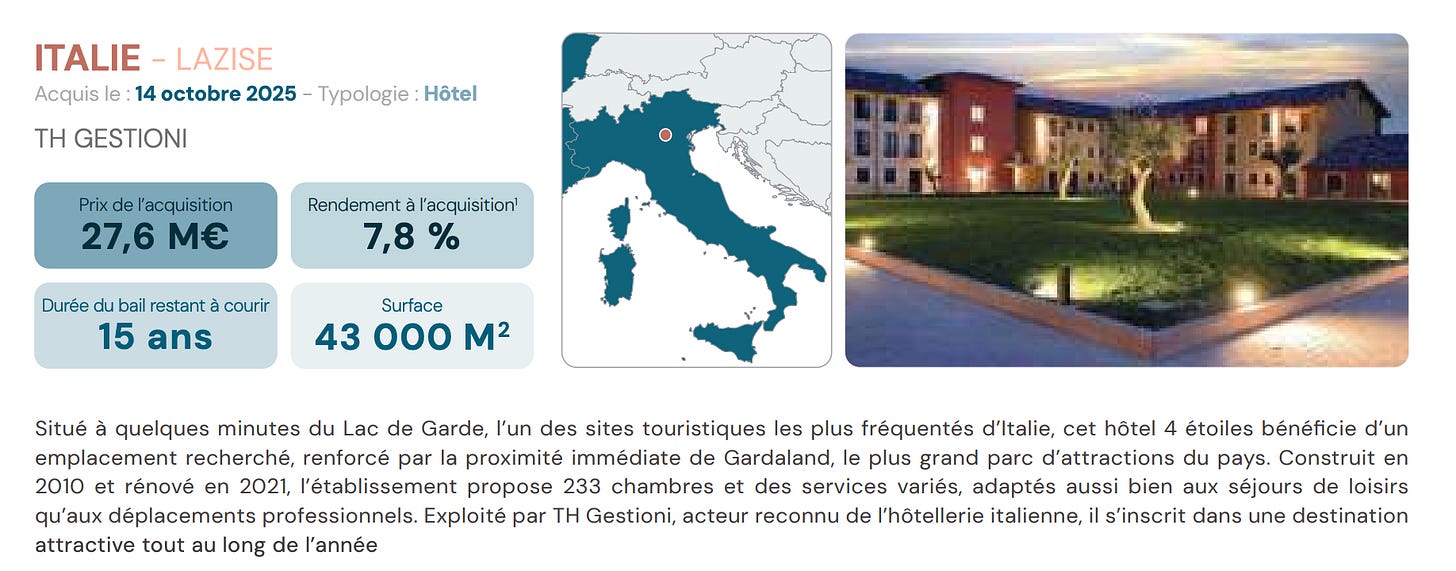 Qualité du patrimoine : Les acquisitions récentes sont globalement de bonne facture. L’immeuble Alphabet à Bois-Colombes (83 M€, livré en 2023) est un actif moderne. L’hôtel à Lazise (Lac de Garde) est un 4 étoiles rénové en 2021.