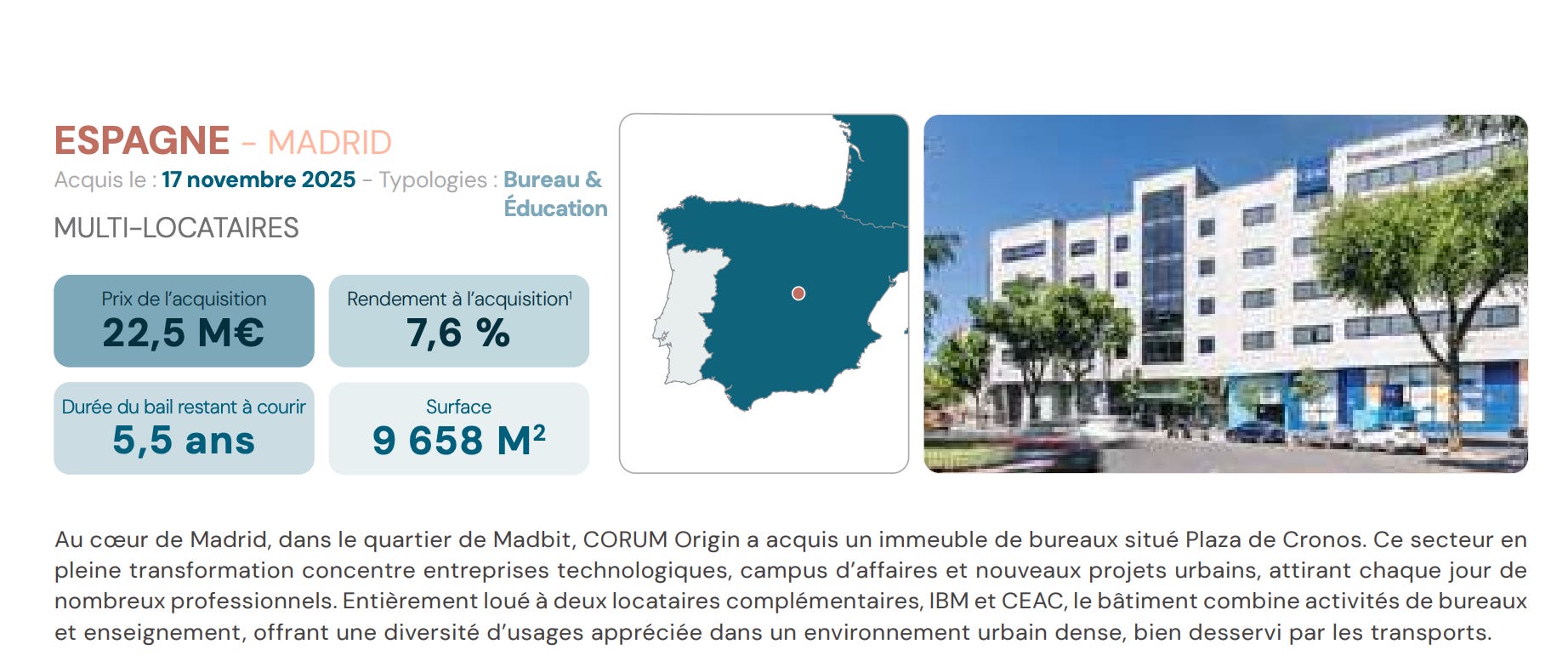 Espagne - Madrid, Bureau et Éducation (22,5 M€, rendement AEM : 7,6 %, bail résiduel : 5,5 ans) : Un immeuble multilocataires (IBM et CEAC) dans le quartier de Madbit, zone en transformation. Le rendement est correct pour Madrid, mais la durée résiduelle du bail de 5,5 ans est inférieure à la moyenne de la SCPI.