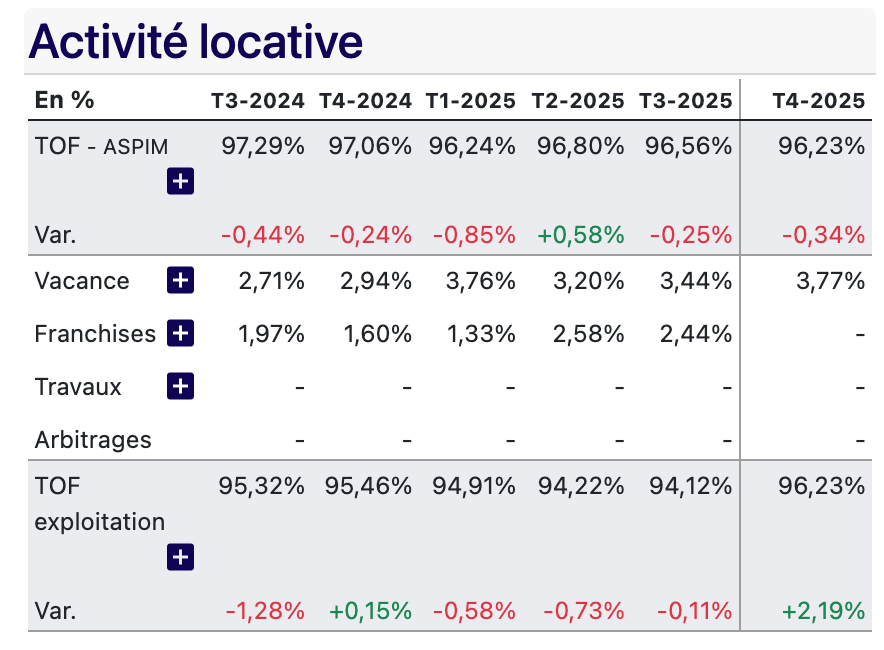 Le taux d’occupation financier (TOF) de CORUM Origin s’établit à 96,23 % au T4 2025. Le TOF mesure le rapport entre les loyers effectivement facturés (y compris les franchises) et les loyers qui seraient perçus si tout le patrimoine était loué aux conditions de marché. C’est l’indicateur le plus pertinent pour évaluer la santé locative. Un TOF de 96,23 % signifie que pour chaque euro de loyer potentiel, la SCPI encaisse effectivement 96,23 centimes.