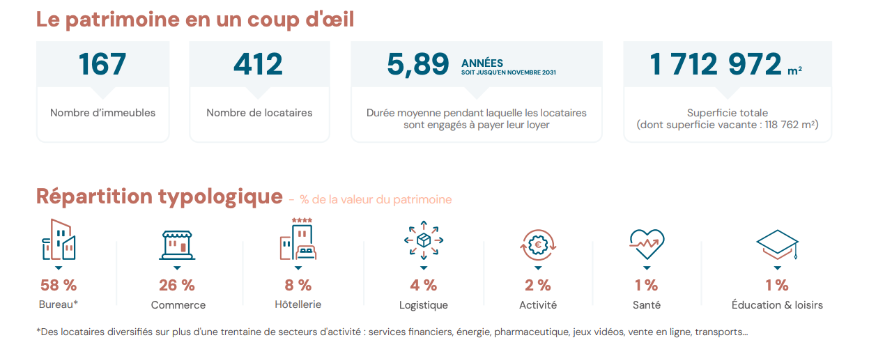 Au 31 décembre 2025, le patrimoine se compose de 167 immeubles (+5 par rapport à fin 2024), 412 locataires (+40 sur l’année), 1 712 972 m² de surface totale (+63 523 m² sur l’année), et une durée résiduelle moyenne d’engagement des locataires (WALT) de 5,89 ans (soit jusqu’en novembre 2031).
