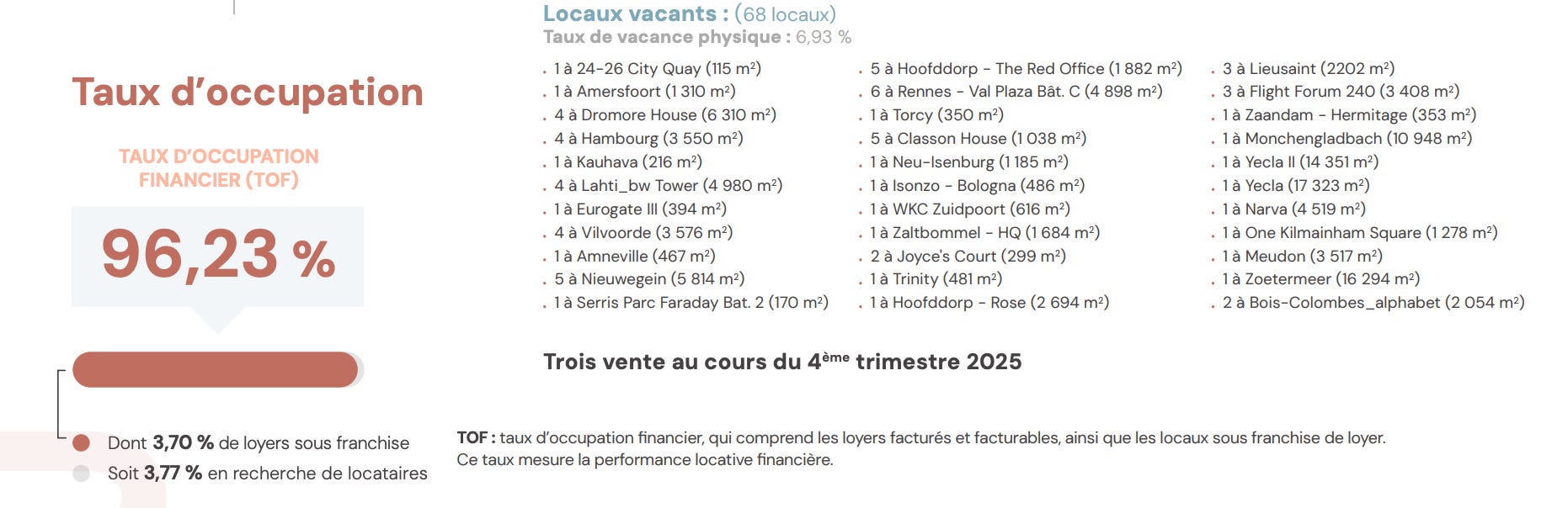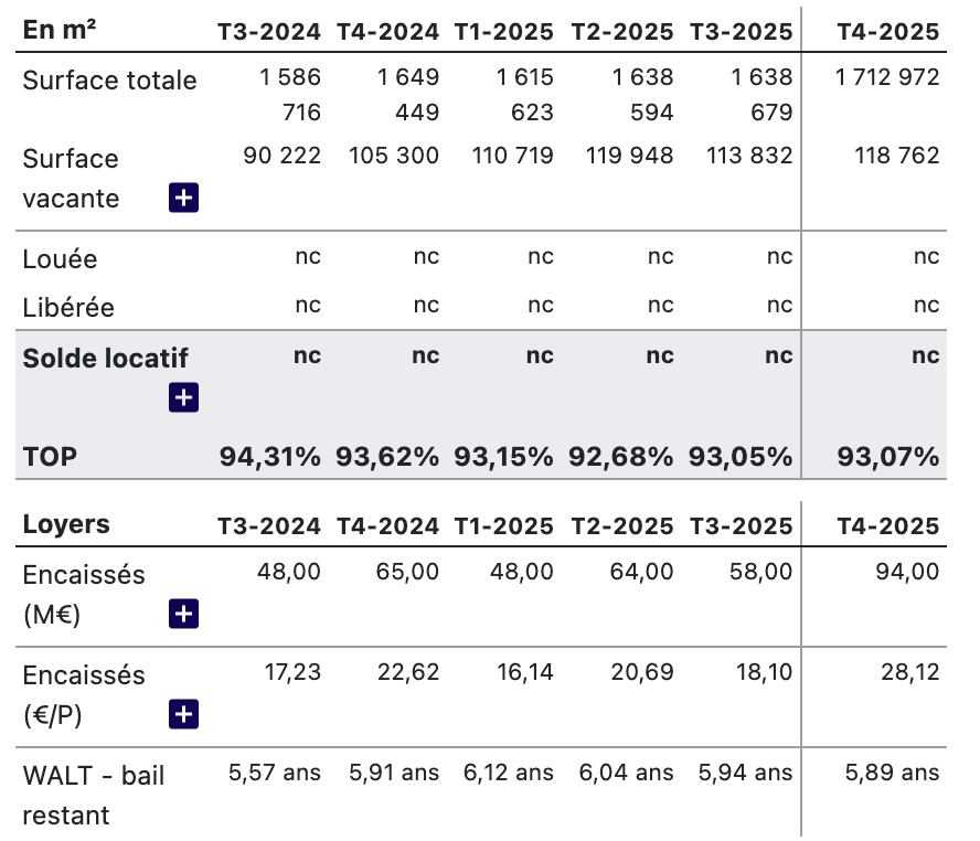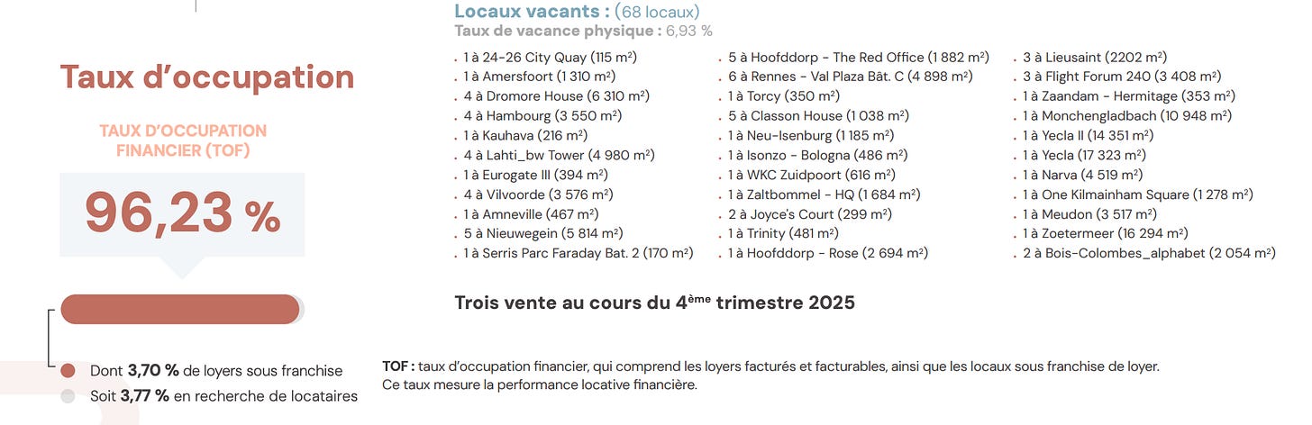 La superficie vacante de 118 762 m² au T4 2025, soit un taux de vacance physique de 6,93 %, est un point à surveiller.