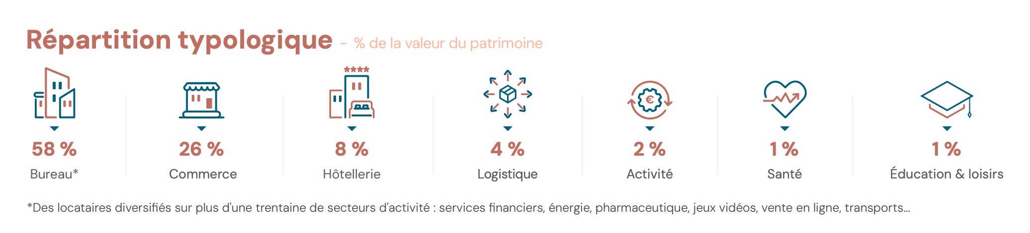 Répartition typologique (en % de la valeur du patrimoine au 31/12/2025) :