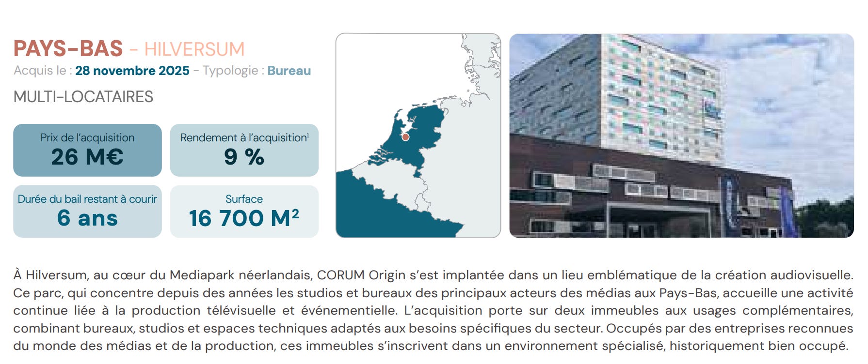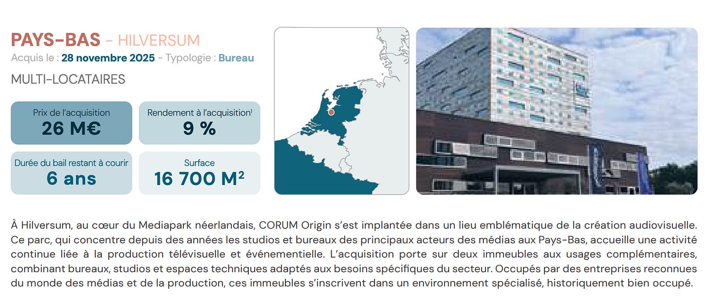 Pays-Bas - Hilversum, Bureau (26 M€, rendement AEM : 9 %, bail résiduel : 6 ans) : Un rendement de 9 % à l’acquisition pour des bureaux aux Pays-Bas est excellent. Cet actif situé dans le Mediapark, spécialisé dans les médias et la production audiovisuelle, constitue un positionnement de niche intéressant mais potentiellement risqué si le secteur médiatique néerlandais se consolide ou se déplace.
