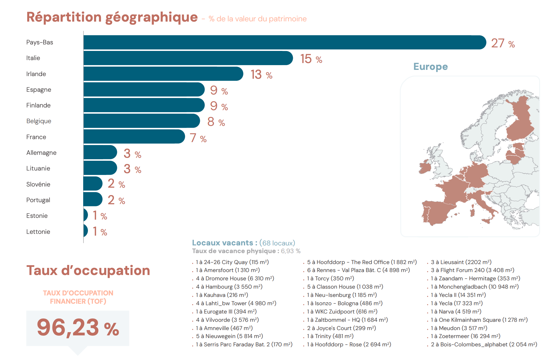 Justificatif : Un patrimoine très bien diversifié géographiquement sur 13 pays de la zone euro, avec une augmentation de la valeur d’expertise en 2024 à contre-courant du marché. Points d’attention sur la surexposition aux bureaux et la vacance physique.