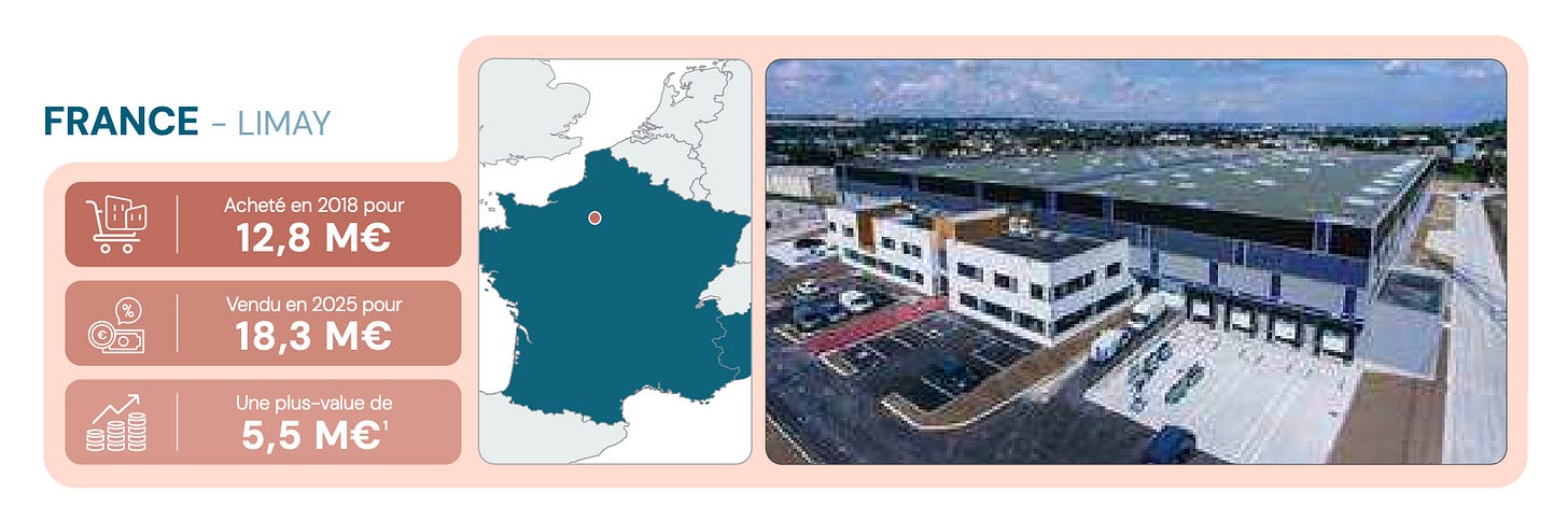 L’immeuble logistique de Limay (France), acheté 12,8 M€ en 2018, a été vendu 18,3 M€ (+5,5 M€ de plus-value, soit +43 %).