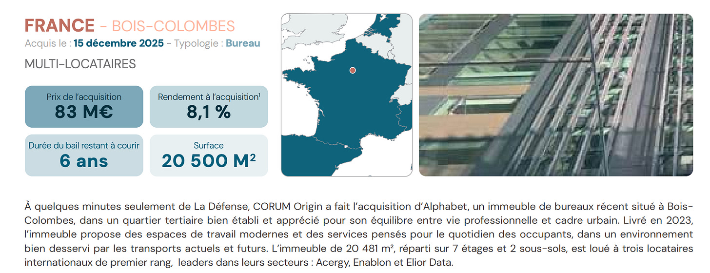 Le rendement de 8,1 % pour un actif quasi neuf en première couronne parisienne est remarquable il reflète les conditions favorables aux acheteurs dans le cycle actuel. Cet actif fait passer la France de 3 % à 7 % du patrimoine, un rééquilibrage bienvenu.