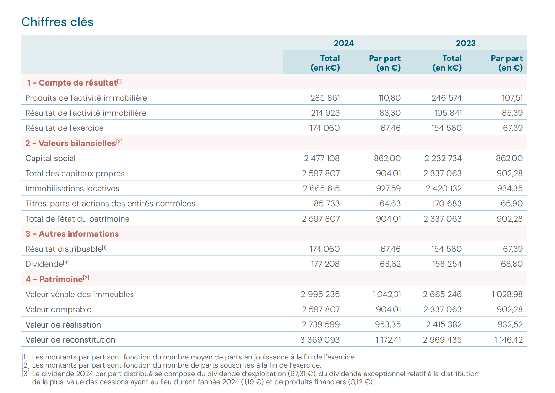 Les loyers encaissés en 2025 s’élèvent à 264 millions d’euros pour 3 342 316 parts, soit environ 79 € de loyers bruts par part.