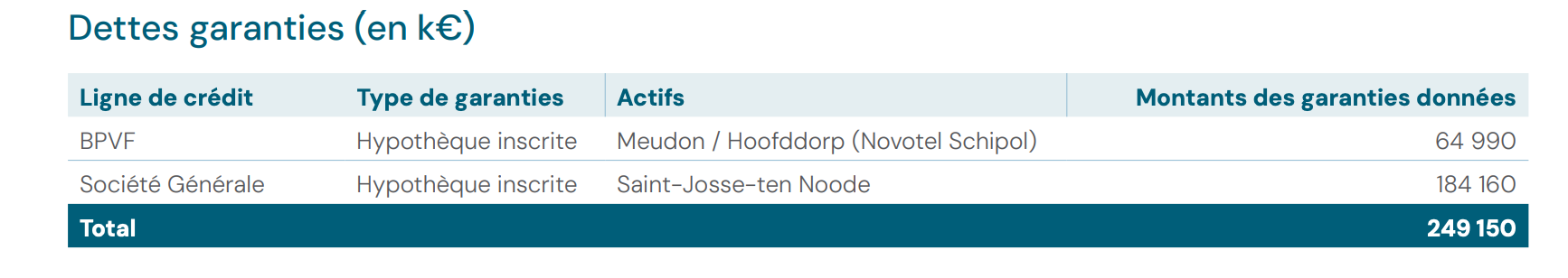 Deux lignes de crédit sont garanties par des hypothèques : 65 M€ garantis par Meudon et Hoofddorp (Novotel Schiphol) auprès de la BPVF, et 184,2 M€ garantis par Saint-Josse-ten-Noode auprès de la Société Générale.