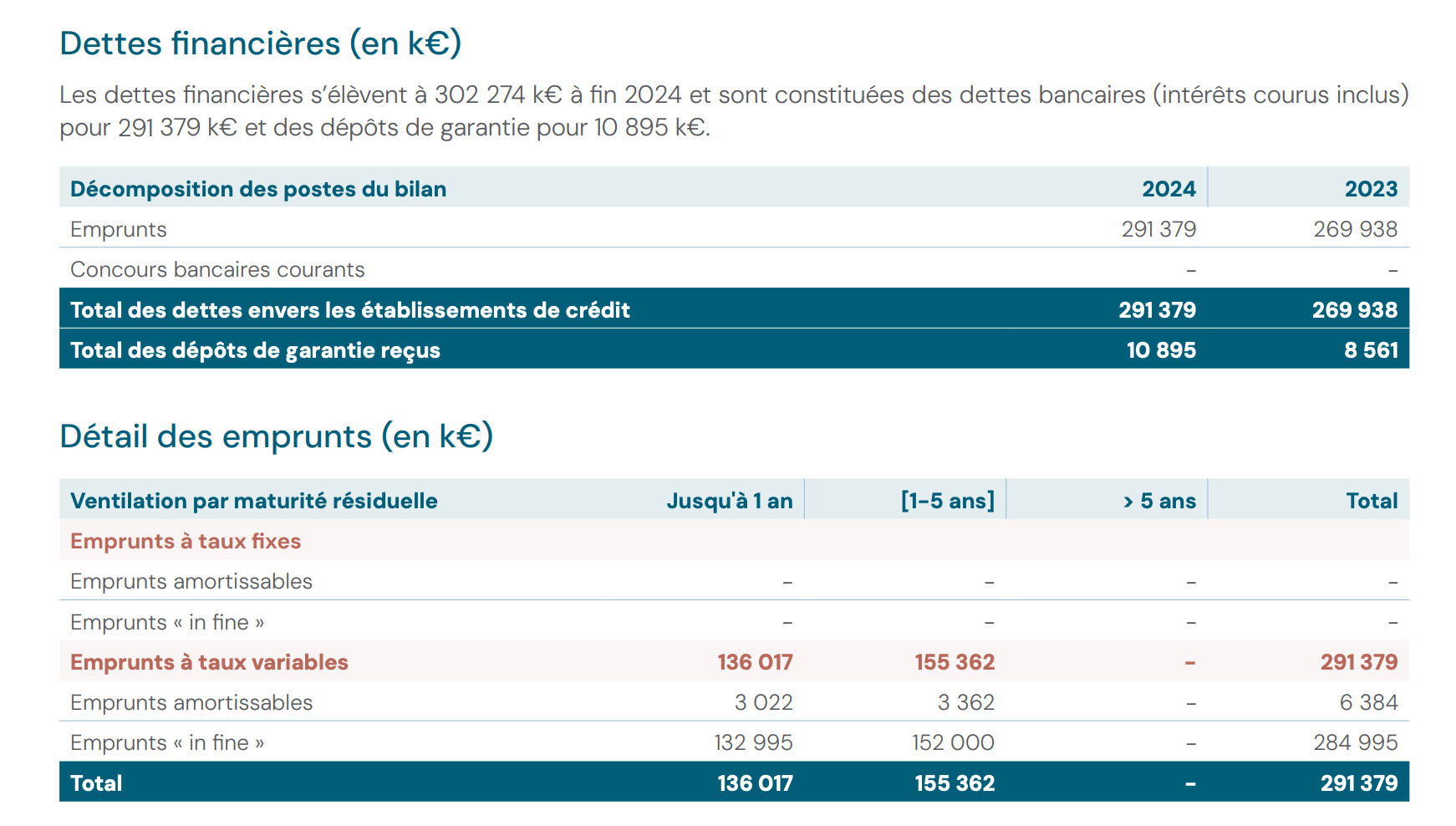 Les dettes financières au 31/12/2024 : Les emprunts bancaires totalisent 291,4 M€ (contre 269,9 M€ fin 2023). La dette est intégralement composée d’emprunts à taux variable, répartis entre des emprunts amortissables (6,4 M€) et des emprunts “in fine” (285 M€). La maturité résiduelle se répartit entre 1 à 5 ans (136 M€) et plus de 5 ans (155,4 M€).