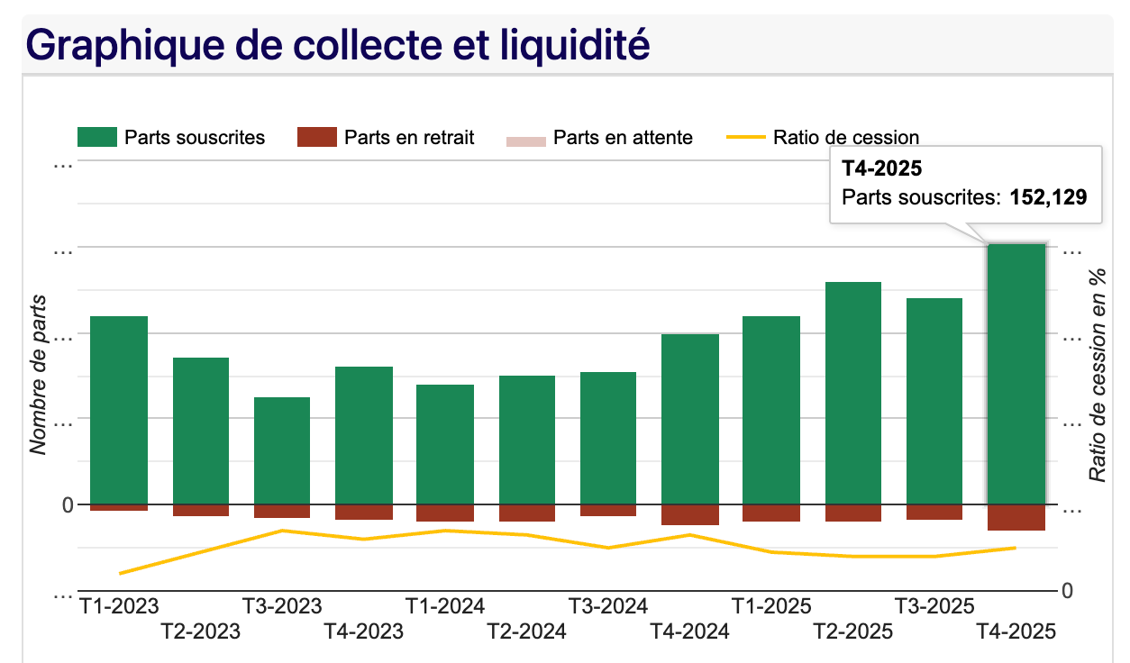 Au T4 2025, 15 086 parts ont été vendues et compensées par de nouveaux associés, et 757 parts ont été échangées entre épargnants sur le marché secondaire. Le ratio de cession (retraits/souscriptions) reste maîtrisé, autour de 8-13 % selon les trimestres, un niveau très sain.