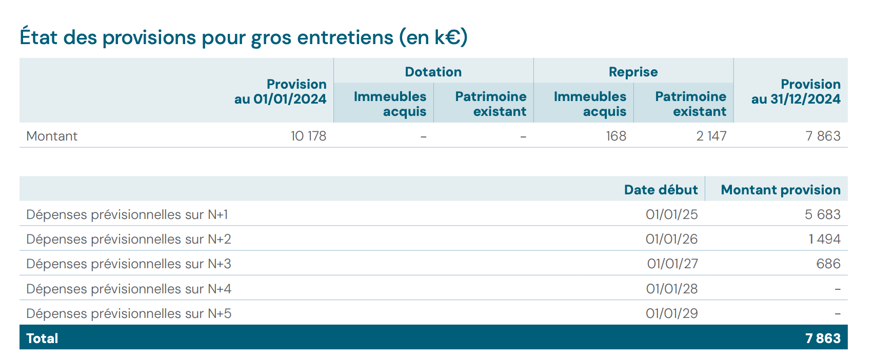 Provision pour gros entretiens : 7,9 M€ au 31/12/2024, avec 5,7 M€ de dépenses prévues en 2025 et 1,5 M€ en 2026. Ce niveau de provision semble raisonnable pour un patrimoine de 3 milliards d’euros (0,26 % de la valeur vénale), mais un patrimoine qui vieillit (certains actifs datent de 1984 en Finlande, des années 2000 en Allemagne) pourrait nécessiter des investissements croissants à moyen terme.