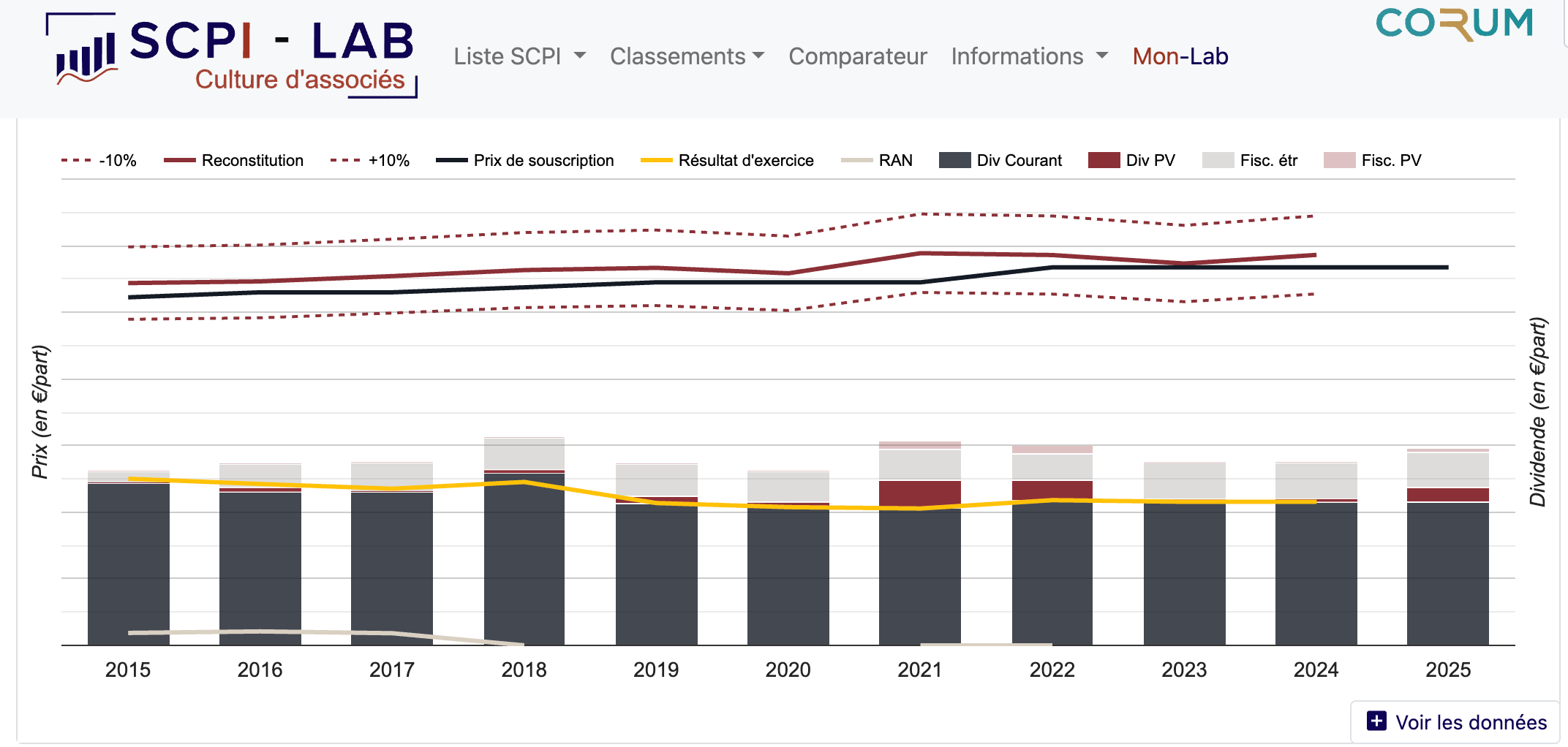 Prenons le dividende de 2014, lorsque le prix de part était de 1 030 € : environ 65,40 € brut. Corrigé de l’inflation cumulée d’environ 20-22 % entre 2014 et 2025, ce dividende en euros constants de 2025 équivaudrait à environ 53-55 € en pouvoir d’achat de 2014. Or, le dividende actuel de 73,80 € sur un prix de part de 1 135 € est nominalement supérieur. L’augmentation du prix de part de 1 030 € à 1 135 € (+10,2 %) a partiellement compensé l’inflation, mais le dividende rapporté au capital investi initial a progressé en nominal et approximativement suivi l’inflation.
