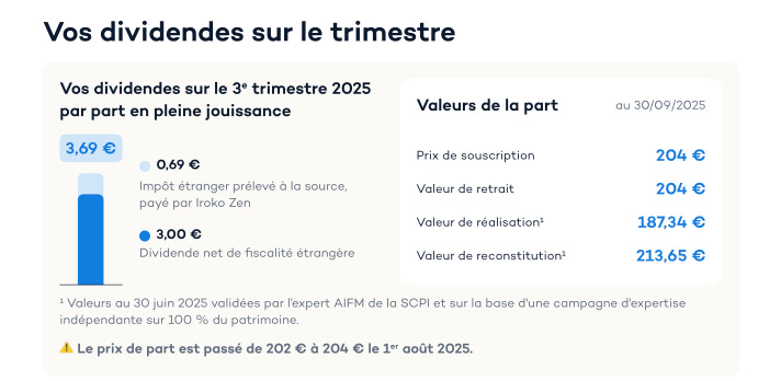 Ratio de redistribution : 3,69 € (dividende brut T3) / 4,14 € (loyers T3) = 89% – Cela signifie que la SCPI redistribue environ 89% des loyers encaissés après charges de gestion, provisions et fiscalité étrangère.