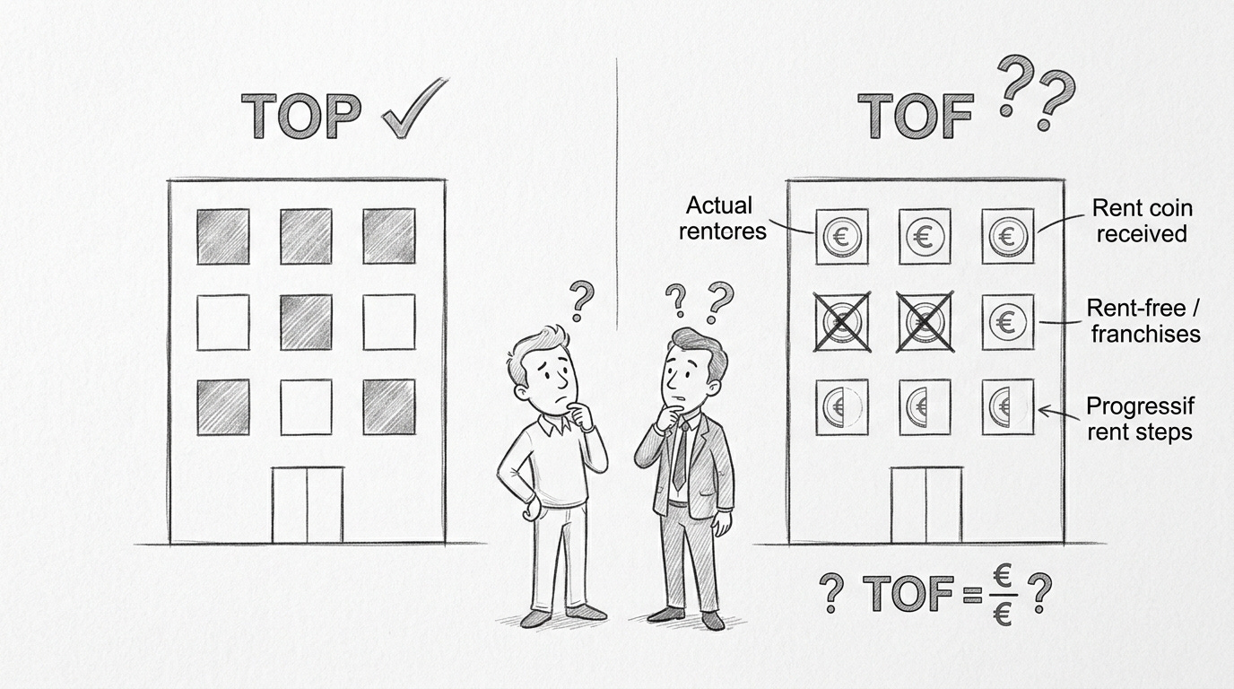Le TOF est bien plus pertinent. Il mesure le rapport entre les loyers effectivement perçus et les loyers qui seraient perçus si tout le patrimoine était loué aux conditions de marché. Il intègre donc les franchises de loyer (périodes gratuites accordées aux locataires) et les paliers progressifs.
