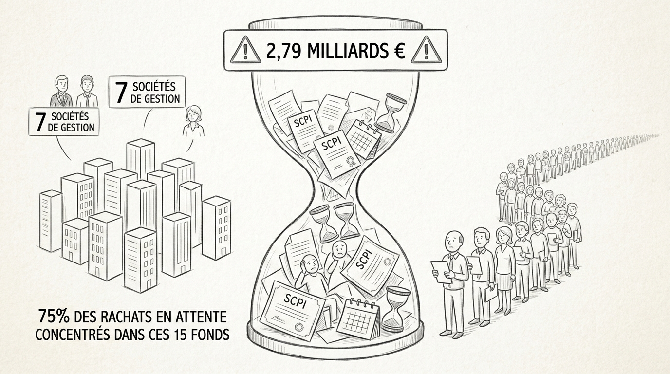 La liquidité est probablement le risque le plus sous-estimé des SCPI. Les données de l’ASPIM au 31 décembre 2025 sont édifiantes : 2,79 milliards d’euros de parts sont en attente de rachat, représentant 3,14% de la capitalisation totale du marché. Ce stock est très concentré : quinze SCPI, gérées par sept sociétés de gestion, regroupent environ les trois quarts des parts en attente.