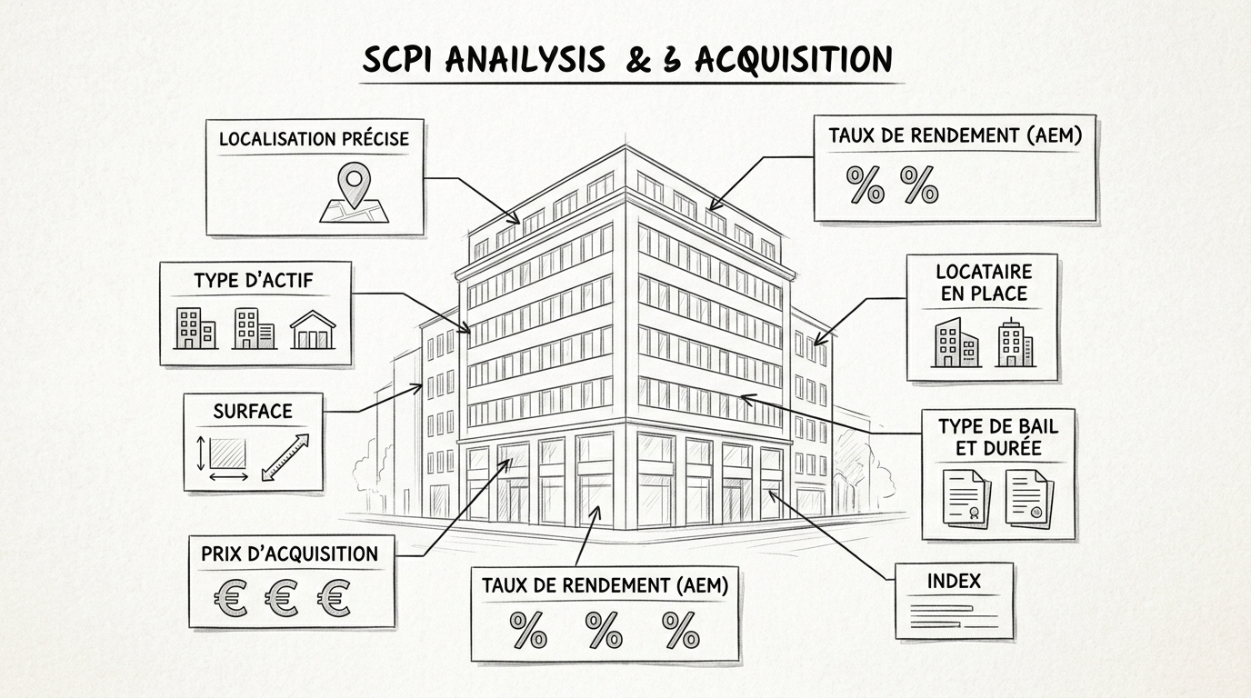 L’objectif est de déterminer si la SCPI achète bien. Un rendement AEM de 4 % sur un bureau en périphérie n’a pas la même signification qu’un rendement de 4 % sur un immeuble prime dans Paris QCA. Je compare chaque acquisition aux conditions de marché et à la stratégie annoncée par la société de gestion.