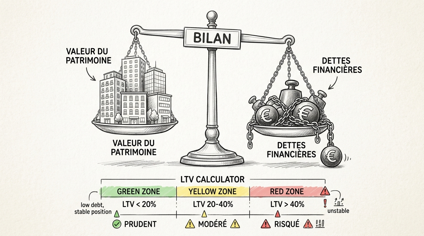 Le bilan révèle la structure financière de la SCPI. Je calcule le LTV (Loan-to-Value) qui mesure le rapport entre les dettes financières et la valeur du patrimoine. Un LTV élevé amplifie les rendements à la hausse comme à la baisse et représente un risque supplémentaire.