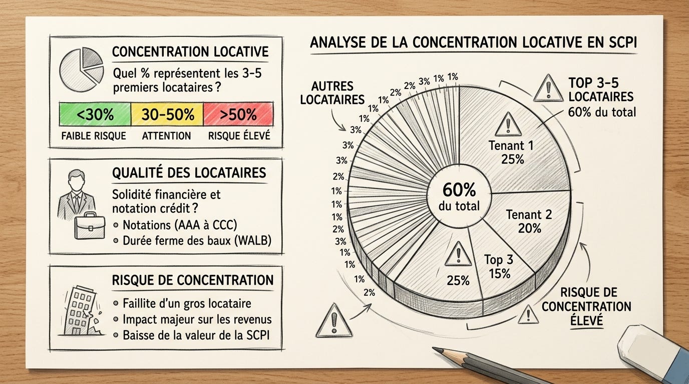 La qualité des locataires détermine la pérennité des revenus. Je relève la concentration locative (quel pourcentage des loyers représentent les trois ou cinq premiers locataires ?), les secteurs d’activité représentés, la solidité financière des principaux locataires.