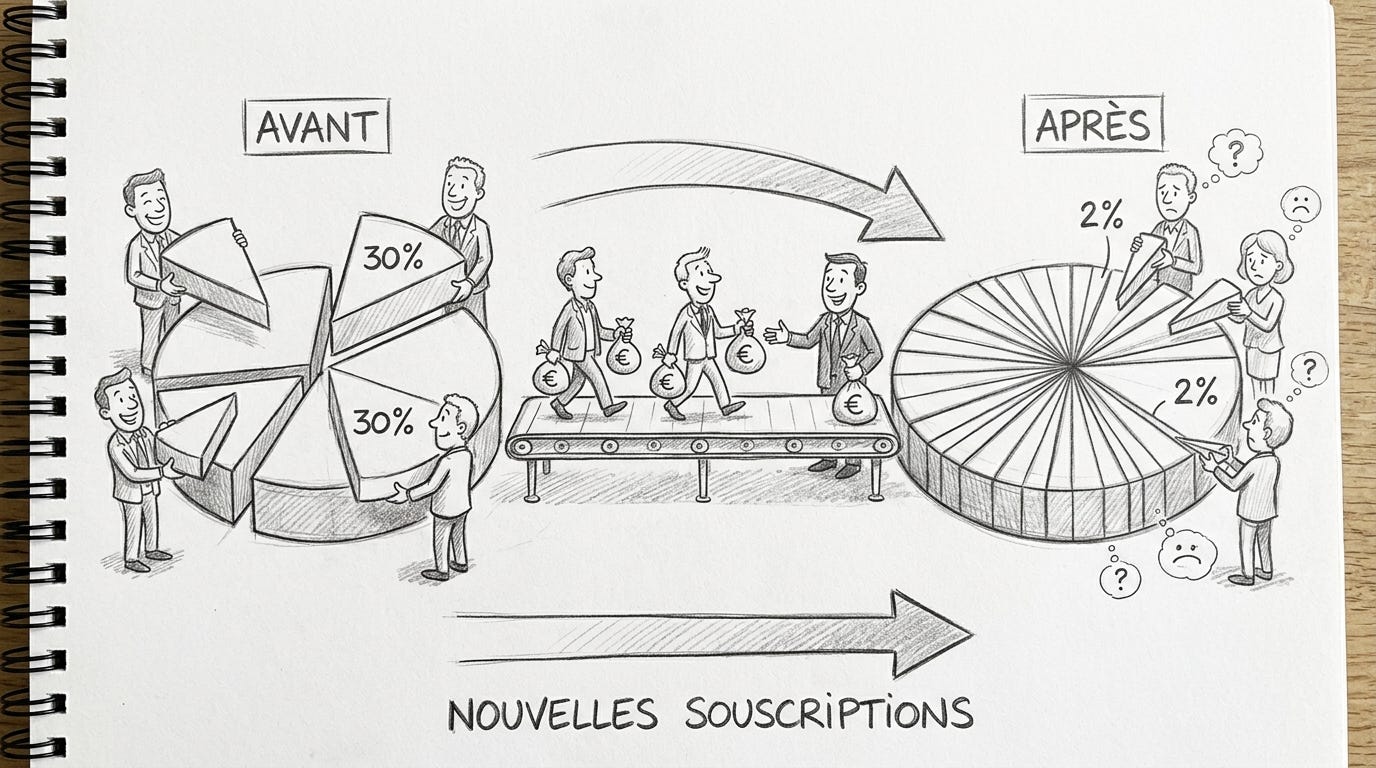 Les SCPI à capital variable collectent en permanence de nouvelles souscriptions. Chaque nouvelle émission de parts dilue mécaniquement la quote-part des associés existants dans le patrimoine. C’est un phénomène que les sociétés de gestion ne mettent jamais en avant, et pour cause.