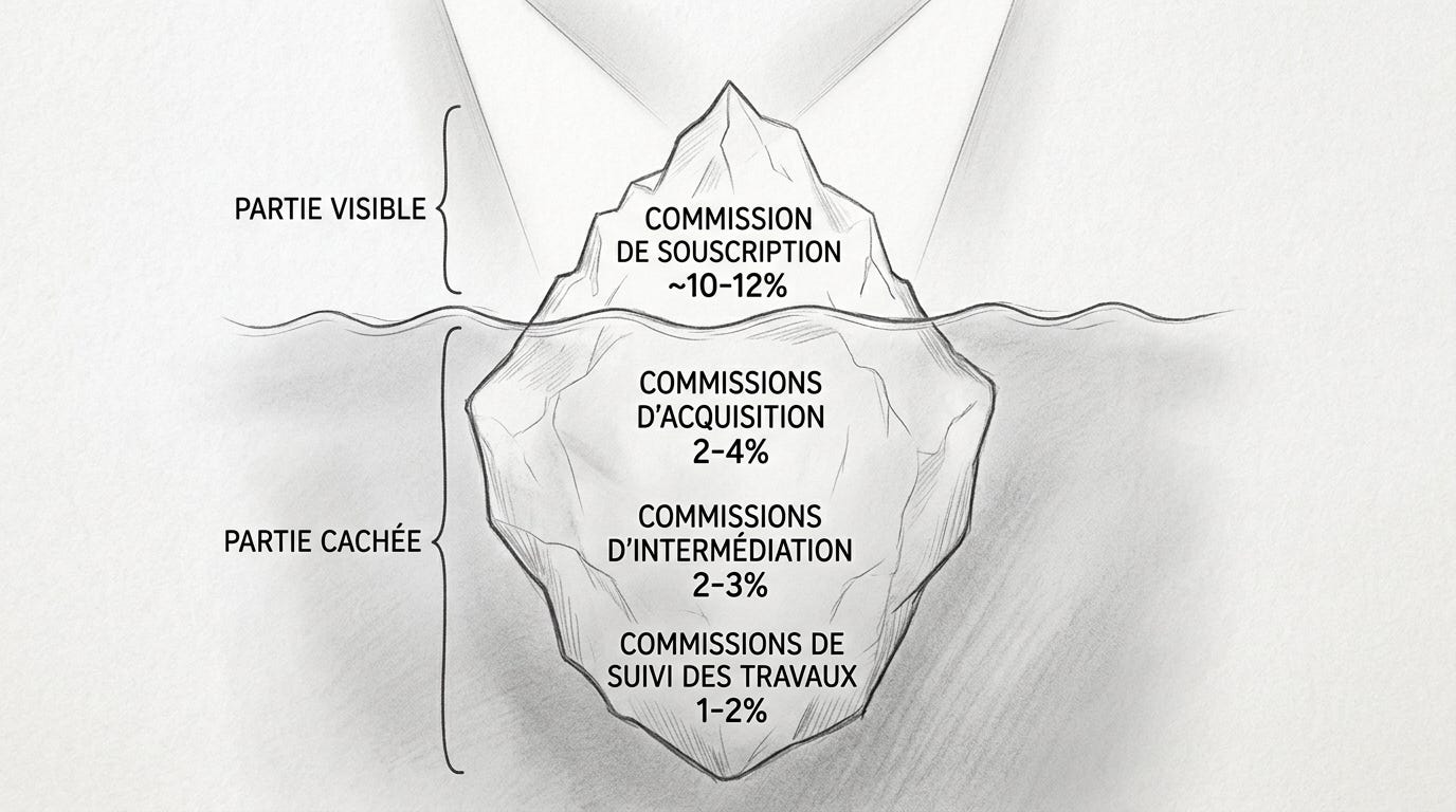 Je traque tous les frais, y compris ceux qui ne s’appellent pas “frais”. La commission de souscription affichée n’est que la partie visible. Je vérifie les commissions d’acquisition et d’intermédiation prélevées sur chaque achat d’immeuble (souvent 2% à 6% cumulés), les commissions de suivi des travaux, les commissions de cession.