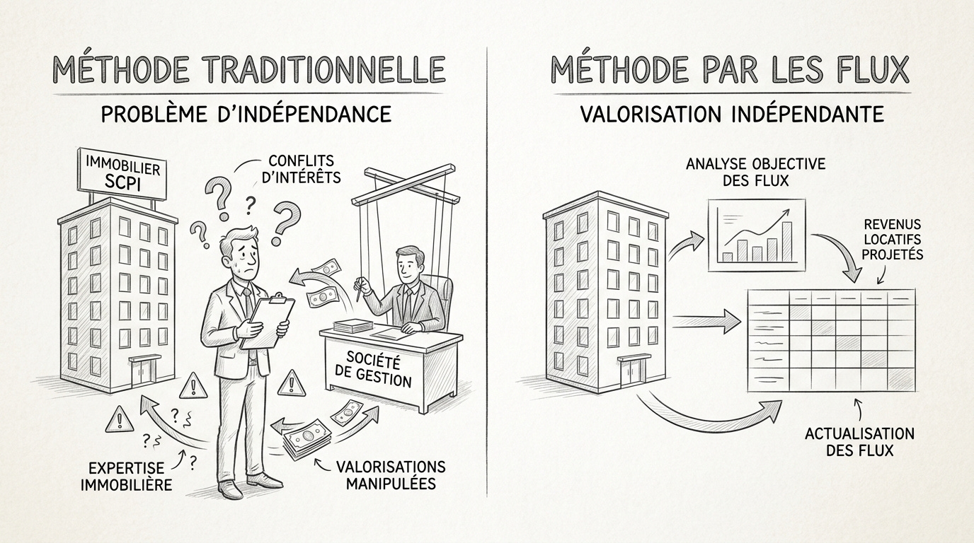 Puisque les expertises immobilières présentent des limites en termes d’indépendance, j’utilise une méthode alternative de valorisation par les flux qui contourne ce problème en se basant sur les loyers réels, vérifiables et indépendants d’une opinion d’expert.