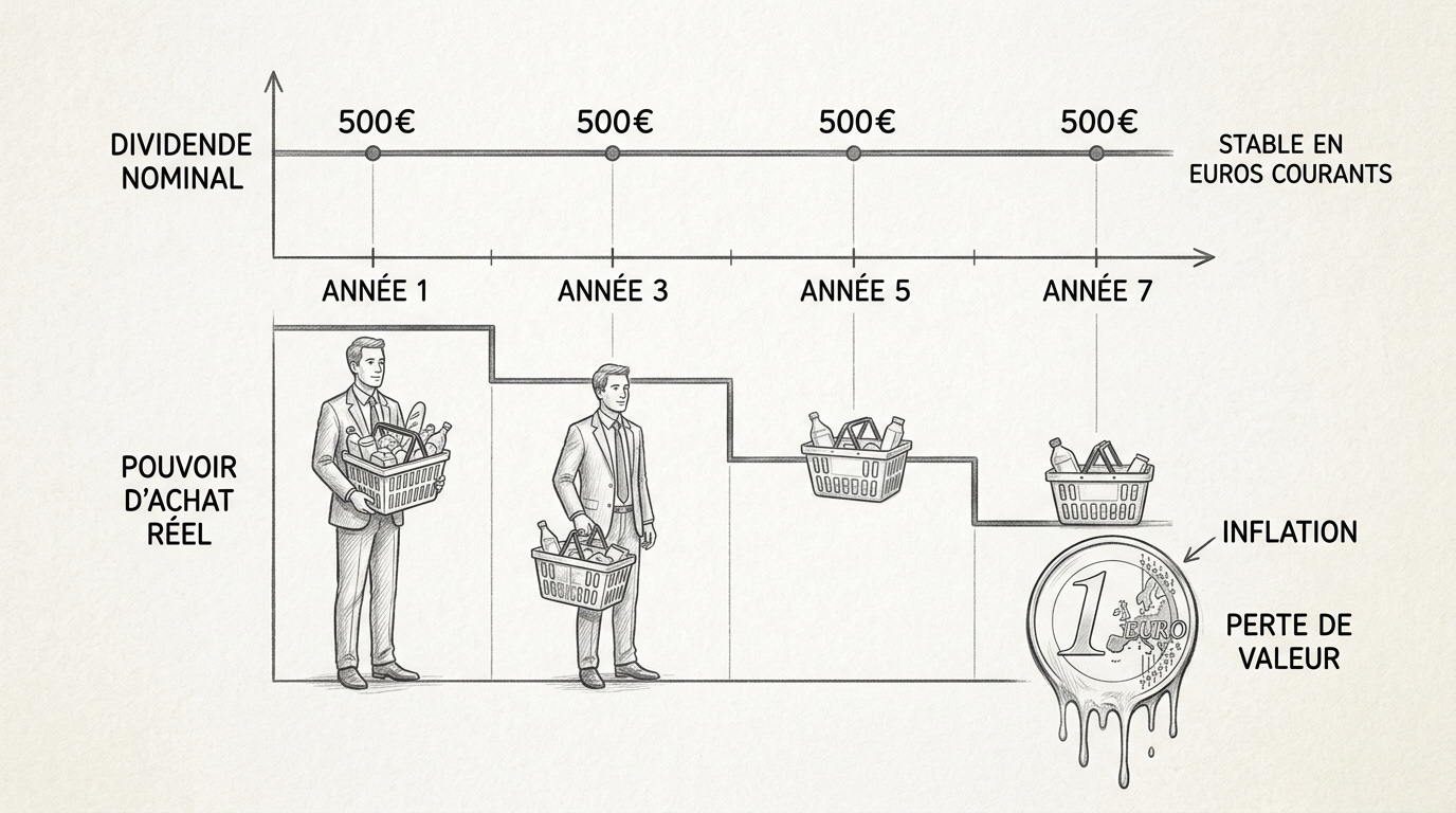 Un point rarement abordé : l’évolution des distributions dans le temps en termes RÉELS, corrigés de l’inflation. Un dividende stable en euros courants perd du pouvoir d’achat chaque année.