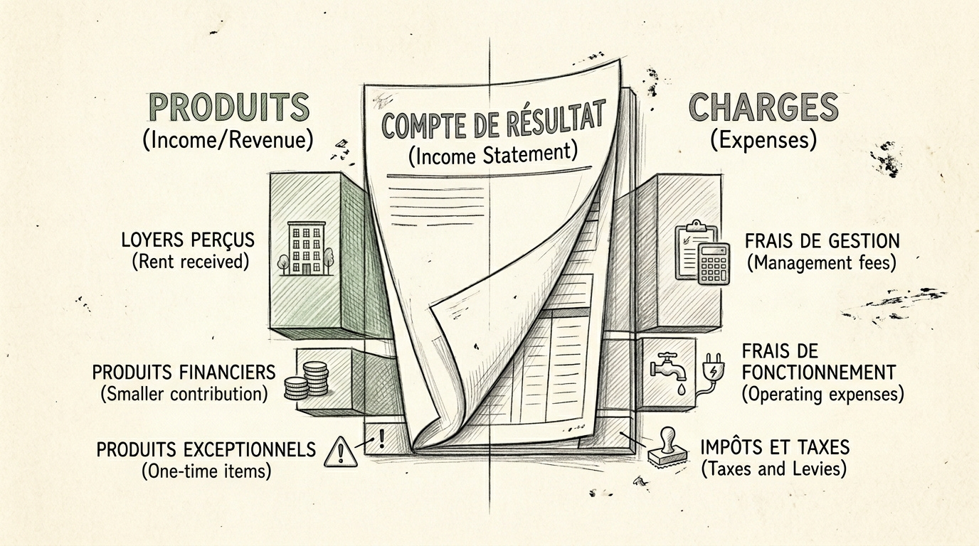 C’est ici que se cache la vérité financière de la SCPI. Je décompose les produits (loyers perçus, produits financiers, produits exceptionnels) et les charges (charges immobilières, frais de société de gestion, créances irrécouvrables, charges financières).
