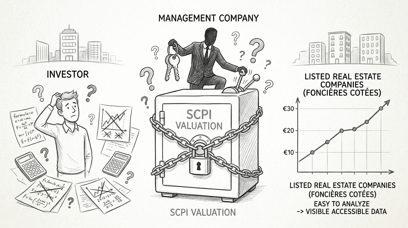 Il est donc très difficile, voire impossible, pour un particulier de calculer lui-même la juste valorisation d’une SCPI. Contrairement à une foncière cotée où l’on peut réaliser une analyse par les flux de revenus actualisés, appliquer des multiples de marché, comparer au cours de bourse qui reflète l’offre et la demande, la valorisation d’une SCPI reste une boîte noire contrôlée par la société de gestion