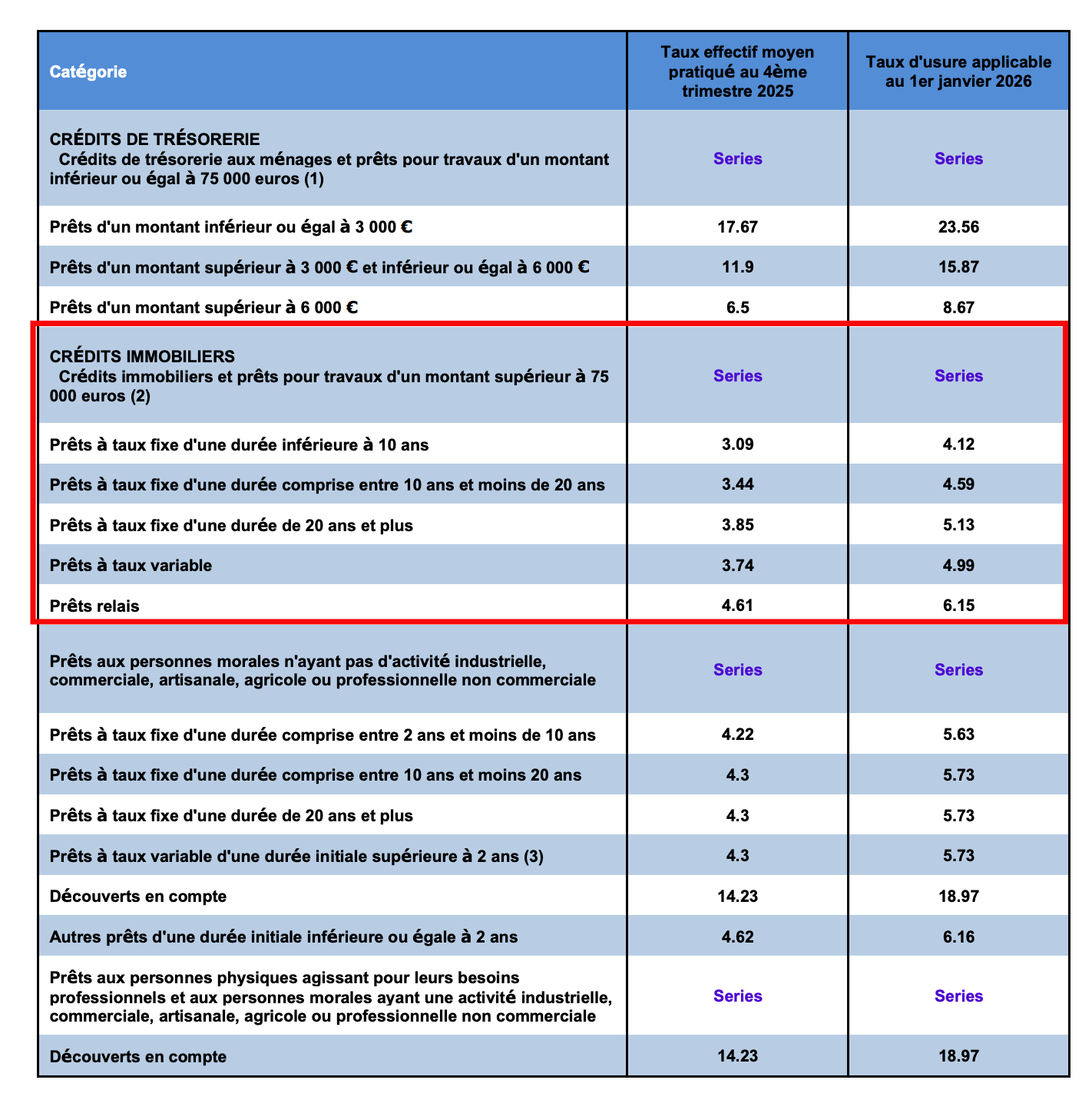 Ce document est le tableau officiel publié par la Banque de France à la fin du T4 2025, qui fixe les taux d’usure applicables au 1er janvier 2026. Il se structure en deux colonnes et trois grandes catégories.